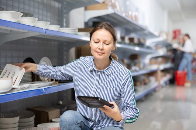 Female,Client,Near,Display,Case,With,Kitchen,Utensils,Chooses,Beautiful